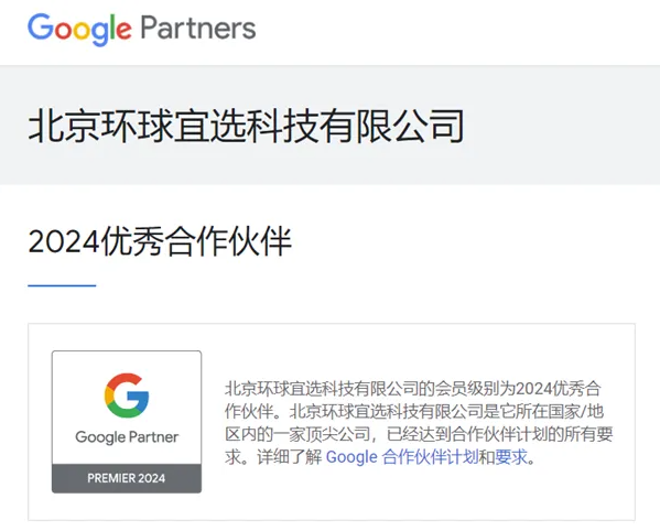 2024年Google优秀合作伙伴资质揭晓!!宜选科技再次获得Google官方颁发的优秀合作伙伴认证奖章。截止目前,宜选已连续9年(2016-2024)被评为Google优秀合作伙伴。(全球只有不到2%的合作伙伴符合这一条件)